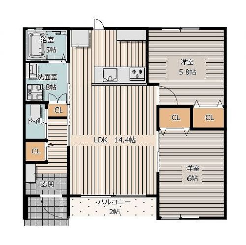 | 間取 | 2 LDK | LDK:14.4帖 洋室:5.8帖 洋室:6帖 バルコニー:2帖 |